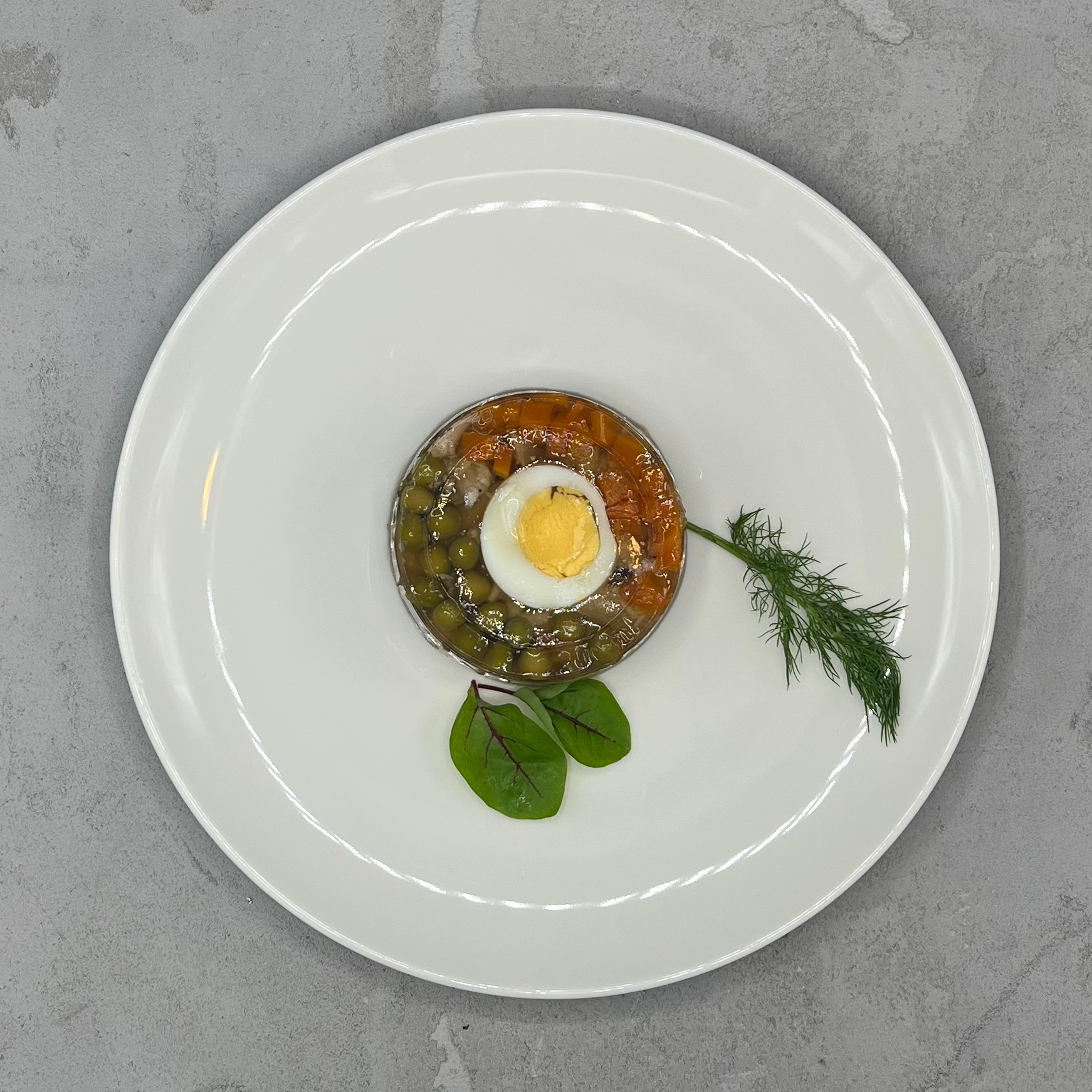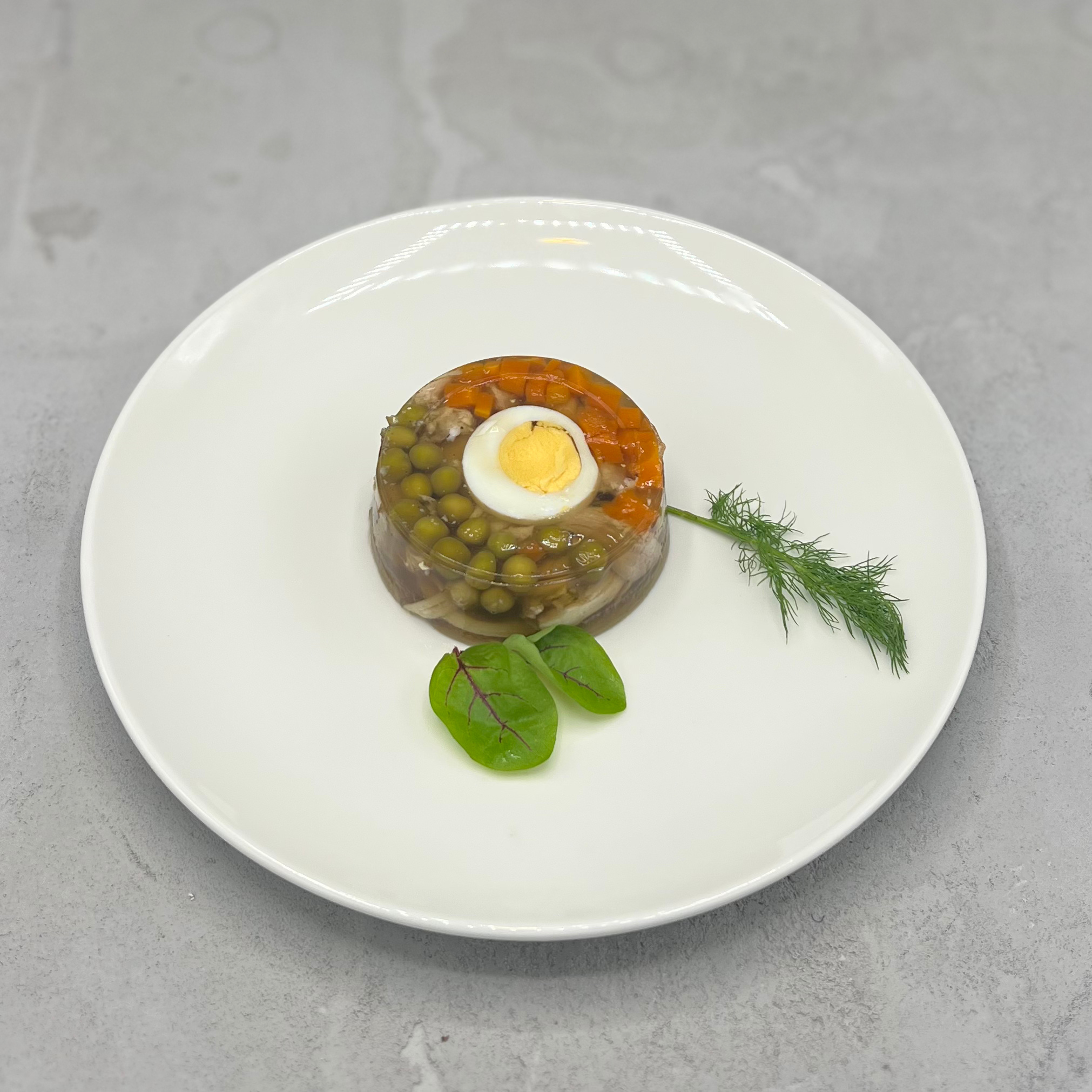 Skład- Udo z kurczaka, jajko, marchew, włoszczyzna, groszek konserwowy, żelatyna, sól, pieprz, ziele angielskie, natka pietruszki.