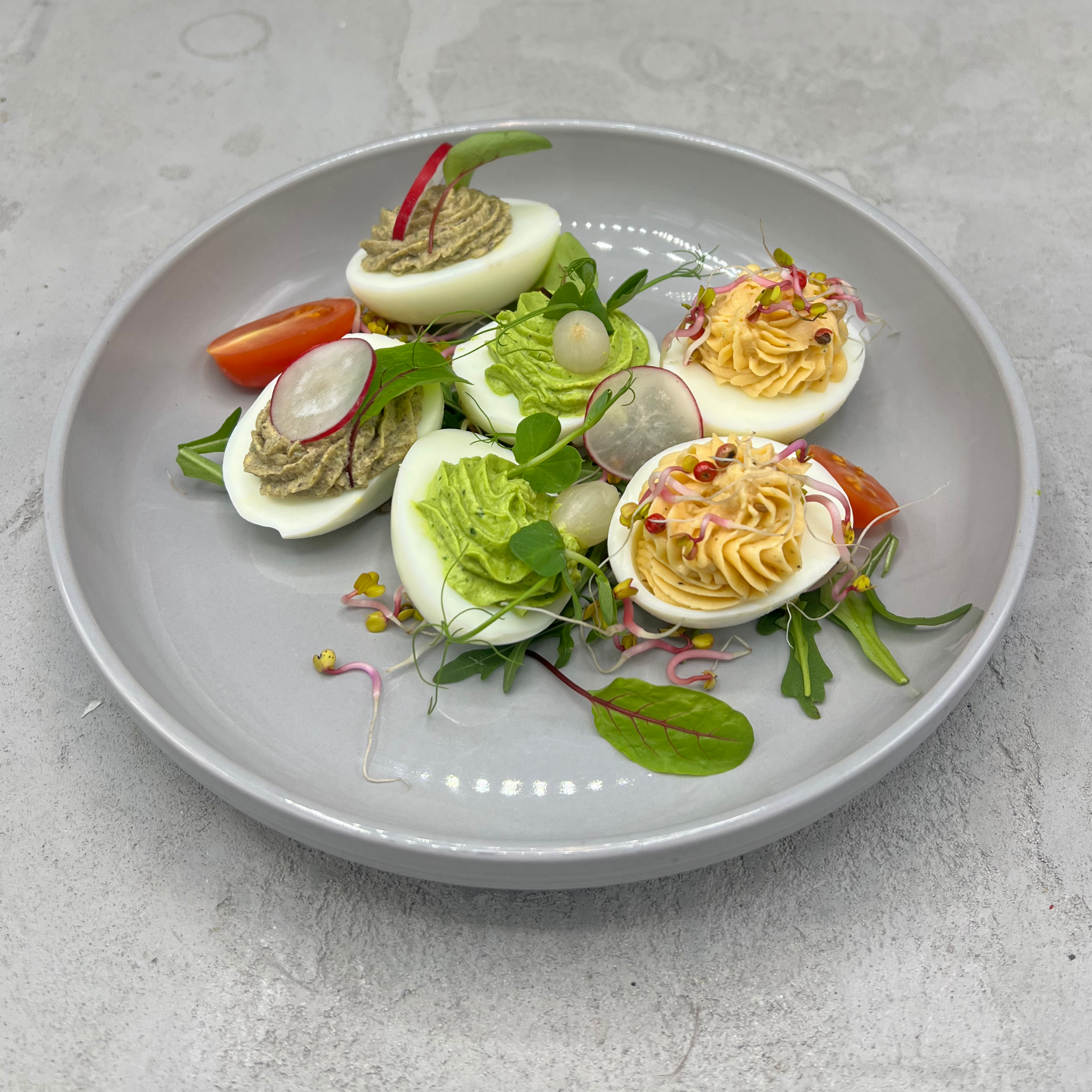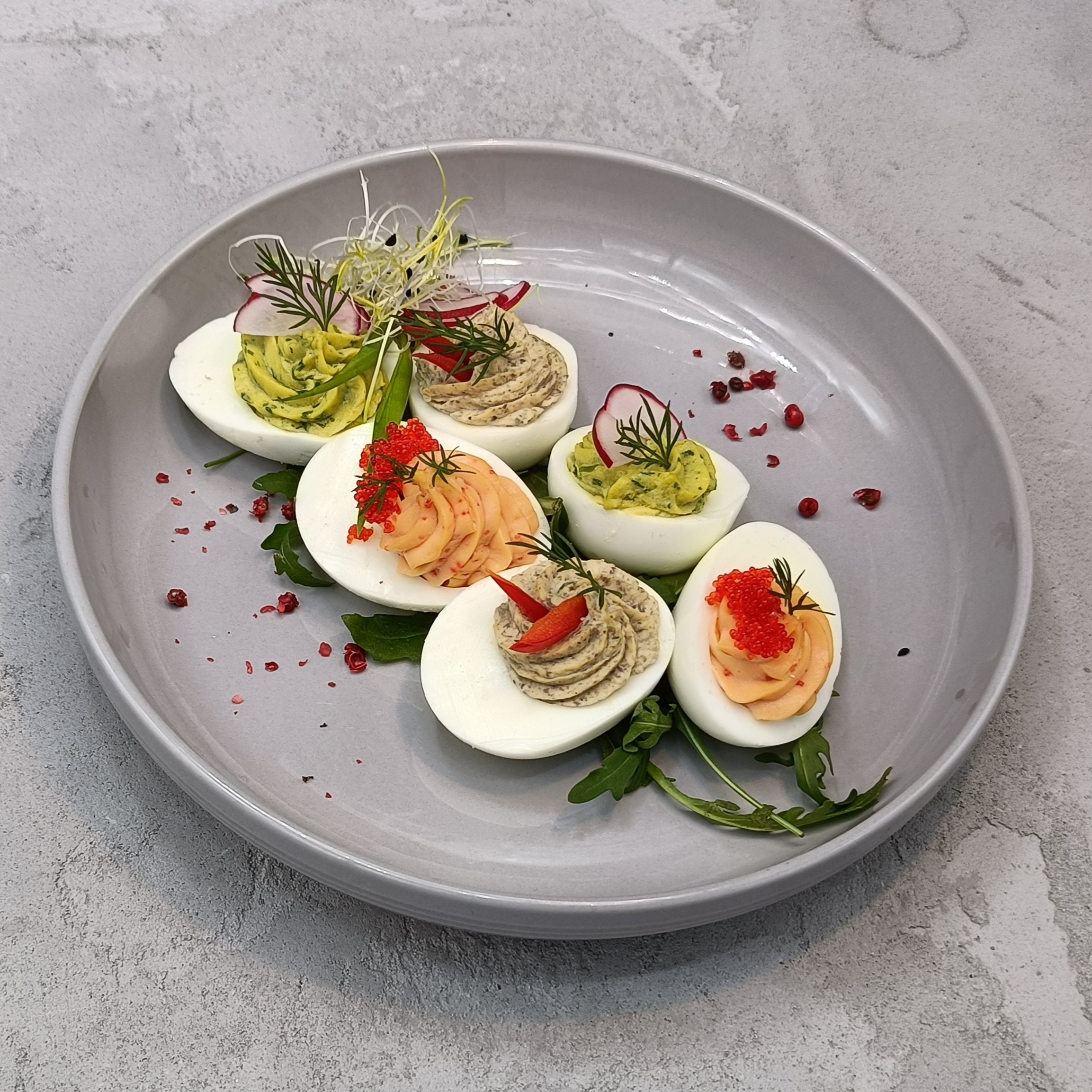 Skład- 2 połówki: jajko, łosoś, majonez, tobiko, sól, pieprz/ 2 połówki: jajko, pieczarka, majonez, pietruszka, sól, pieprz/ 2 połówki: jajko, szczypiorek, majonez, sól, pieprz.