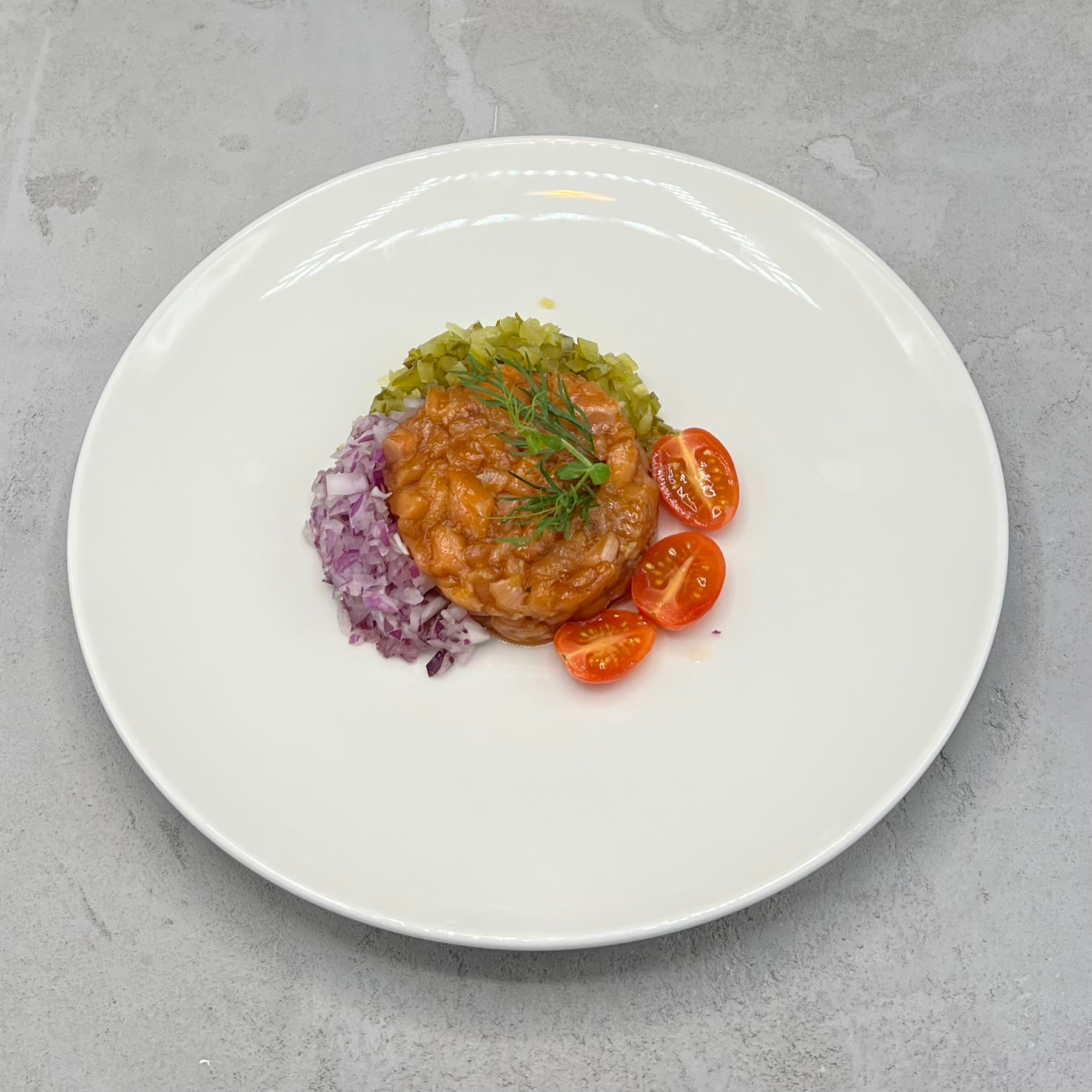 Skład- Łosoś wędzony, ogórek kiszony, jabłko, cebula czerwona,majonez, szczypior, koperek, sól, pieprz.