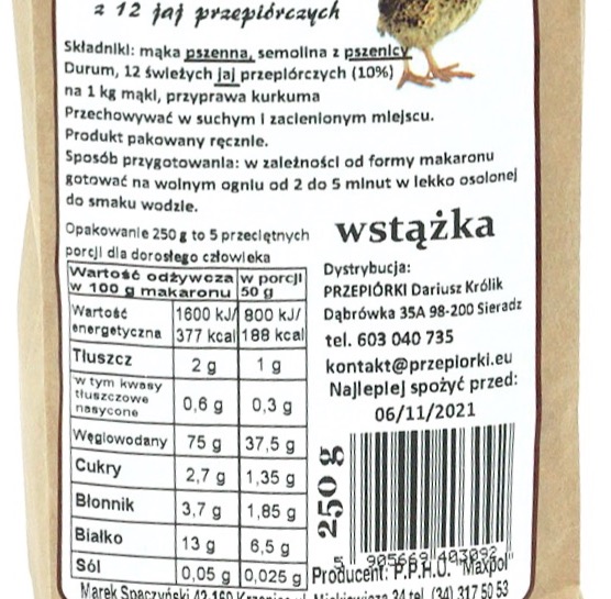 Doceniany przez konsumentów makaron z 12 jaj przepiórczych wyprodukowany na najlepszej mące oraz semolinie. Pakowany w torebki papierowe