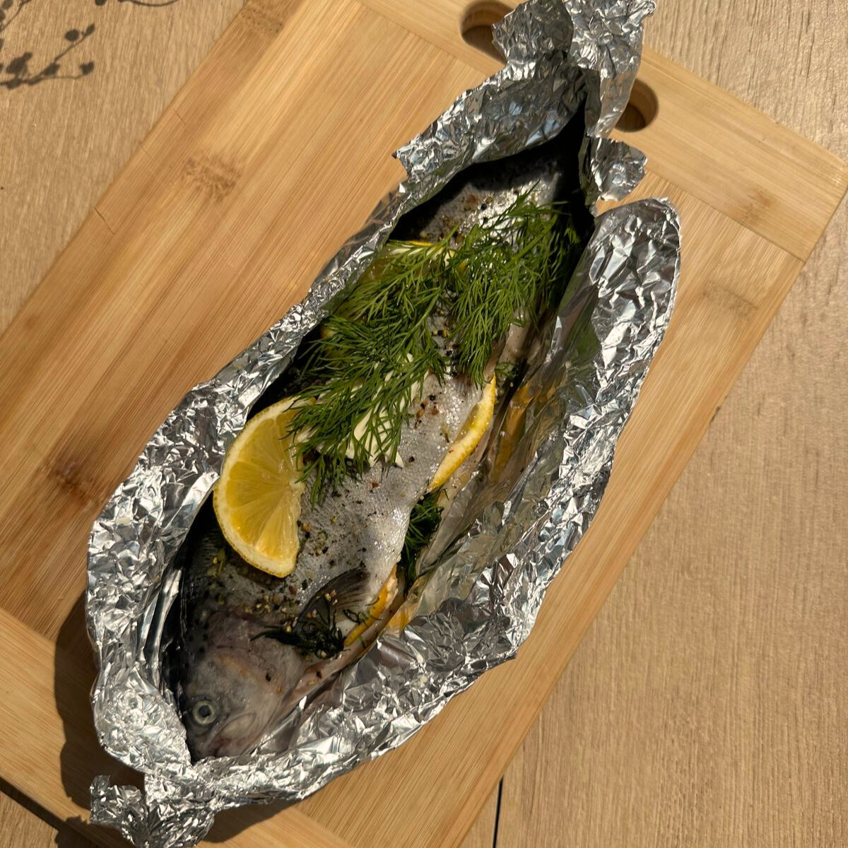 Świeży, surowy pstrąg nadziewany masłem, cytryną i koperkiem – idealny do grillowania w folii.