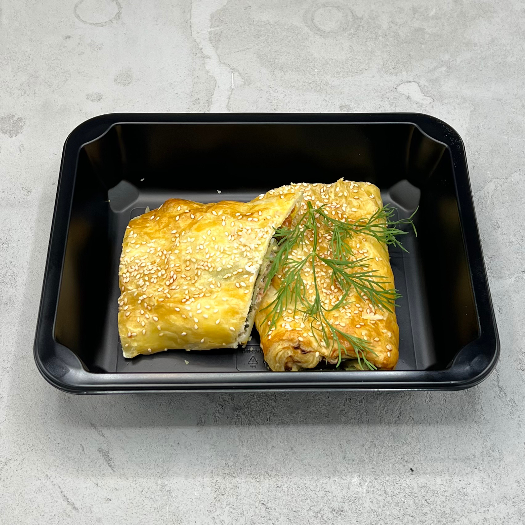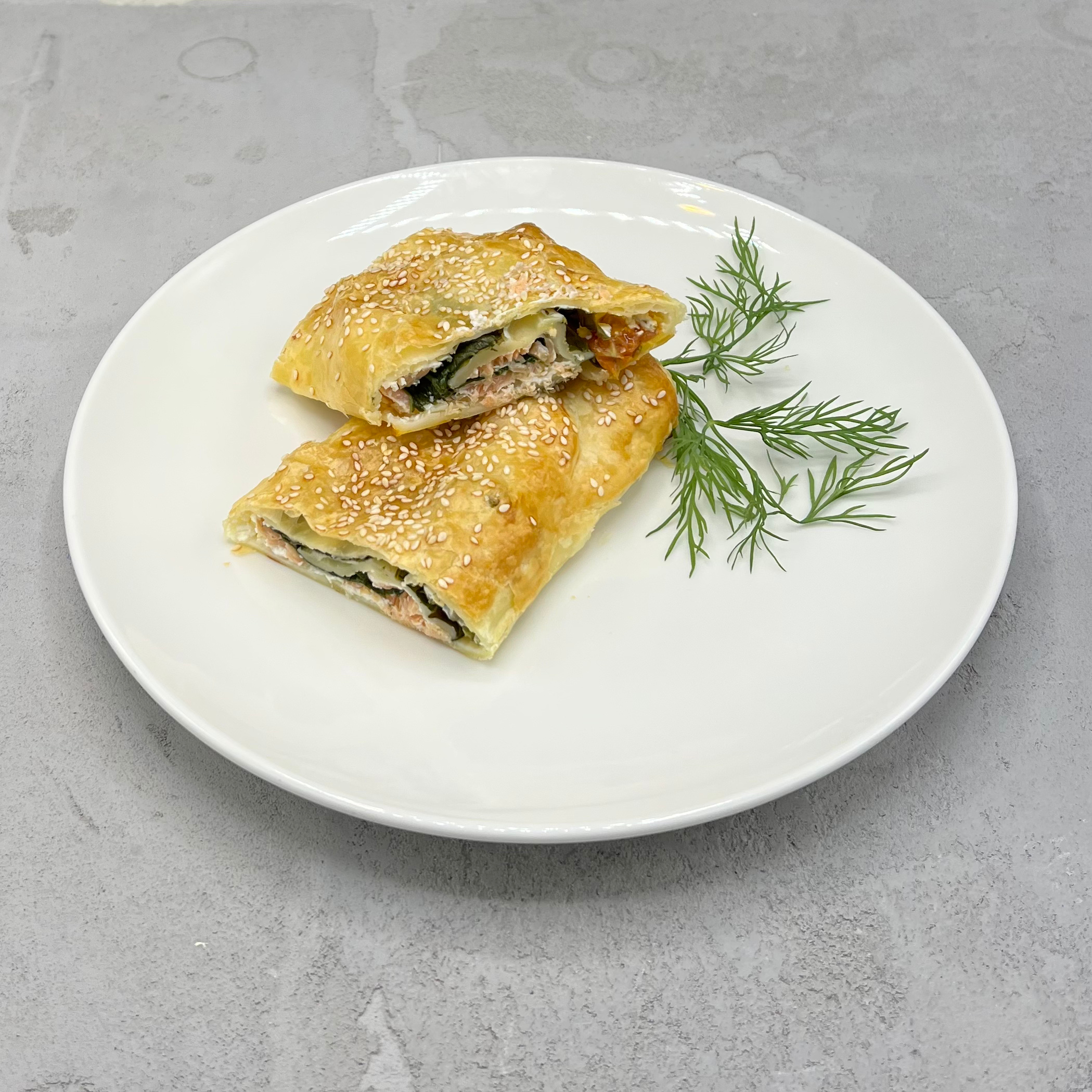 Efektowne roladki ze francuskiego ciasta z kremowym serkiem, wędzonym łososiem i szpinakiem. (Waga gotowego produktu może wahać się w granicach +/- 5%.)