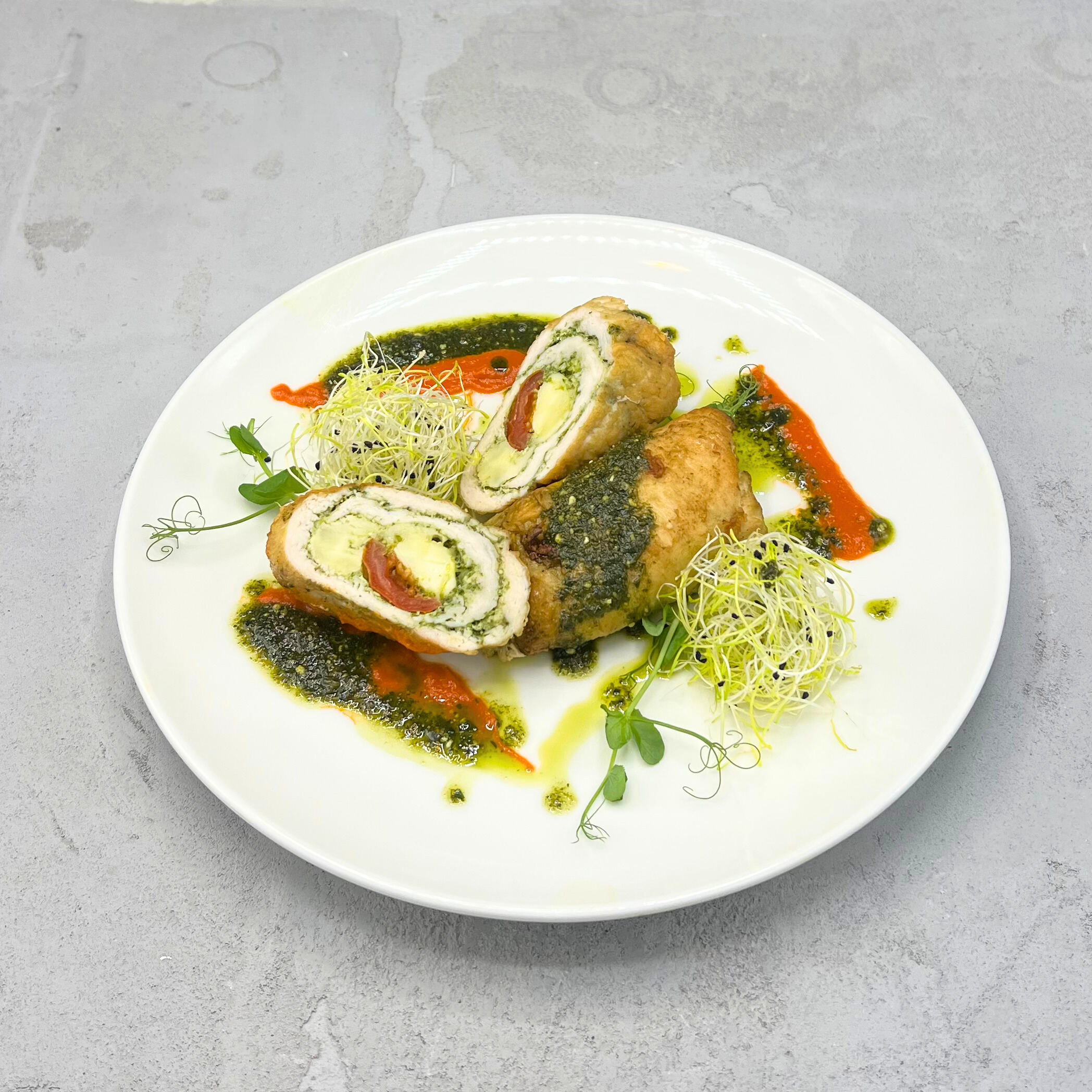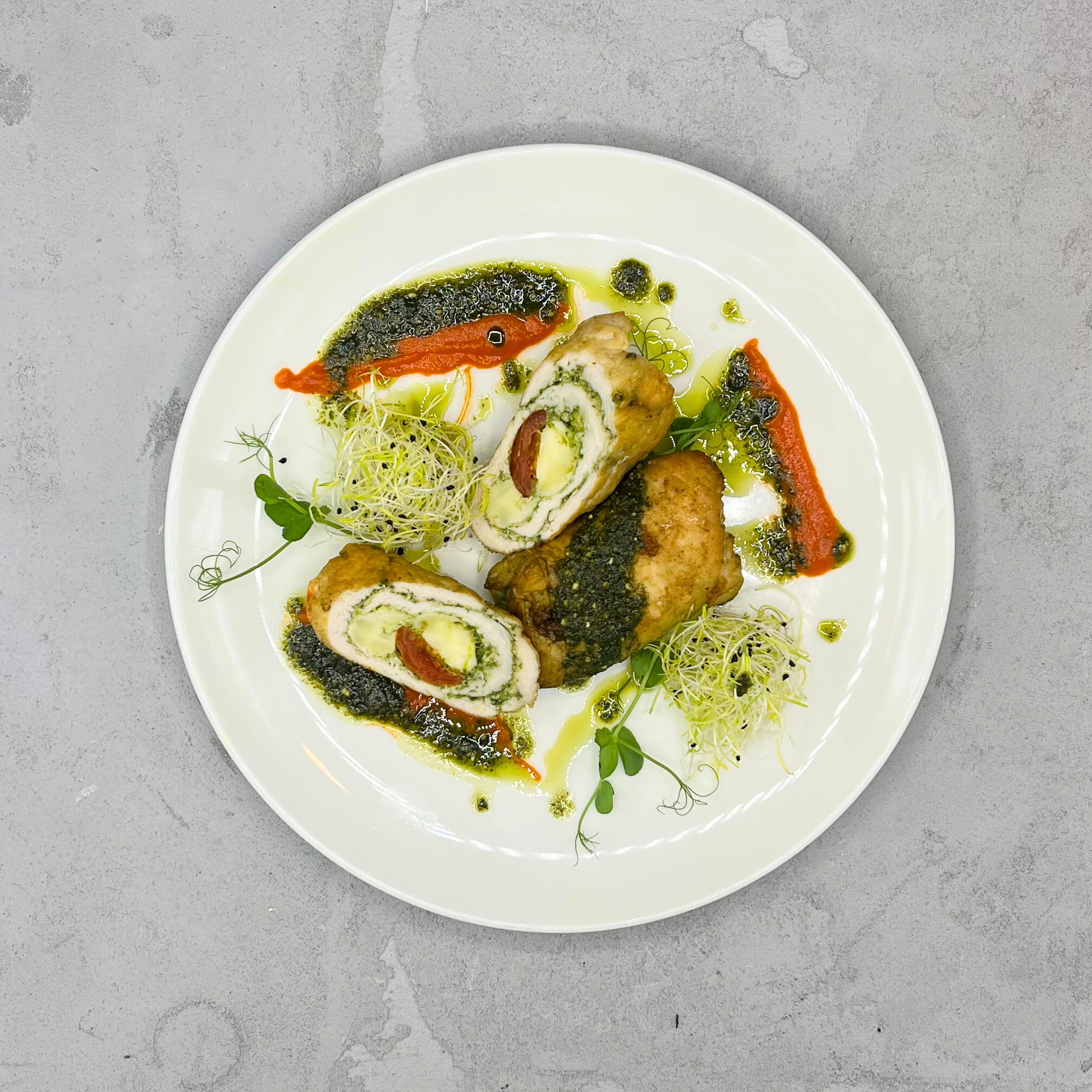Przykład podania- Roladki ułóż na talerzu na warstwie sosu bazyliowo-pomidorowego, udekorowane świeżymi listkami bazylii. Dodaj do nich pieczone ziemniaczki i grillowane warzywa, takie jak cukinia i papryka, aby uzupełnić danie kolorystycznie i smakowo.