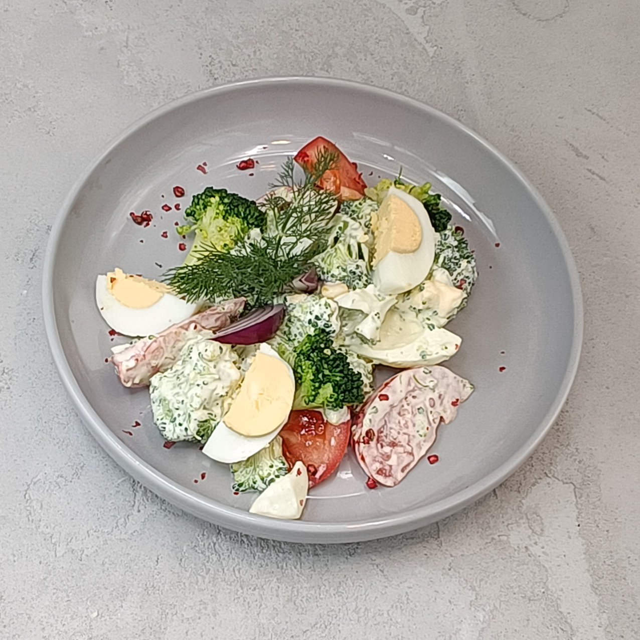 Skład- Brokuł, pomodor, jajko, kukurydza, majonez, przyprawy, szczypior.
