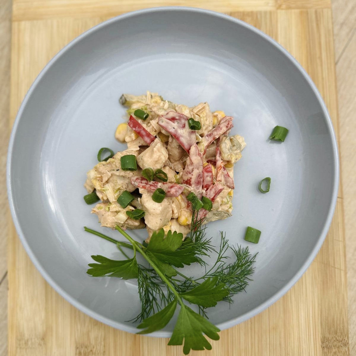 Skład: pierś z kurczaka, papryka, ogórek konserwowy, jajka, sałata pekińska, cebula czerwona, kukurydza, majonez, ketchup, sól, pieprz, tymianek, czosnek, oregano, papryka słodka.