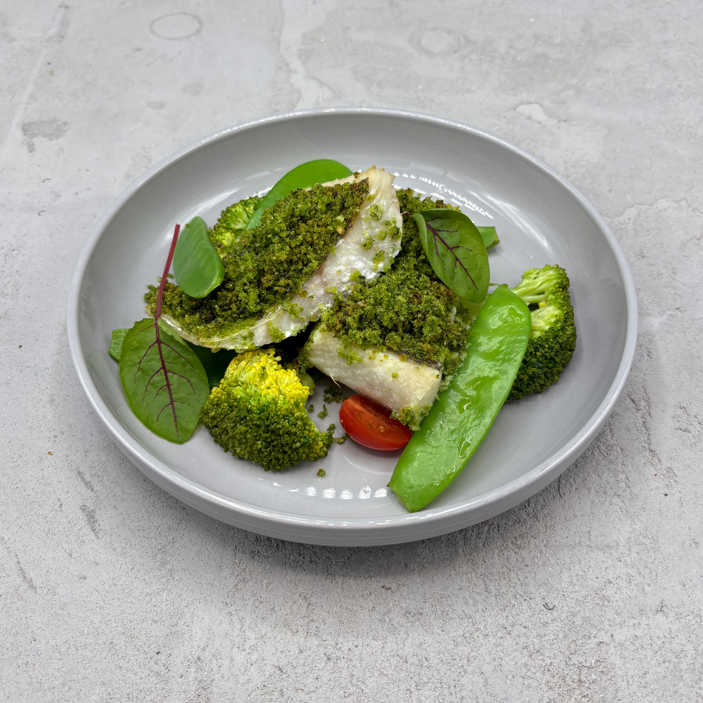 Delikatny filet z sandacza, okryty chrupiącą kruszonką z nutą świeżych ziół, serwowany w towarzystwie soczystych zielonych warzyw.