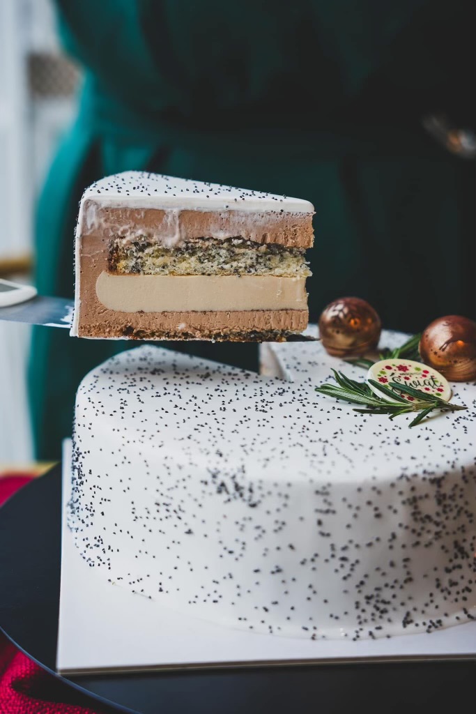 Rozsmakuj się w wyjątkowym Torcie Świątecznym, który łączy w sobie harmonię wyrafinowanych smaków i świąteczną magię. Podstawę tworzy delikatny biszkopt migdałowy, którego subtelna nuta orzechowa wspaniale współgra z chrupiącymi prażynkami, dodającymi lekkości i tekstury. W środku kryje się prawdziwy skarb – karmelizowane banany, których naturalna słodycz podkreślona jest karmelowym akcentem, oraz egzotyczna marakuja, wnosi świeżość i tropikalny aromat. Całość otula intensywnie aksamitna czekolada deserowa, która dopełnia kompozycję głębokim smakiem.