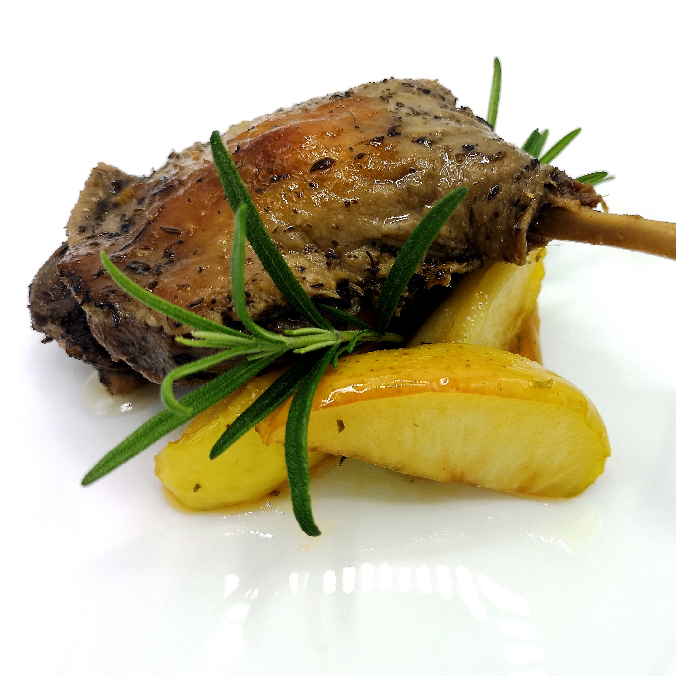 Udo z kaczki z prażonymi jabłkami z dodatkiem ziół (udo z kaczki 130g+ jabłka prażone 50g). Waga gotowego produktu może wahać się w granicach +/- 5%.