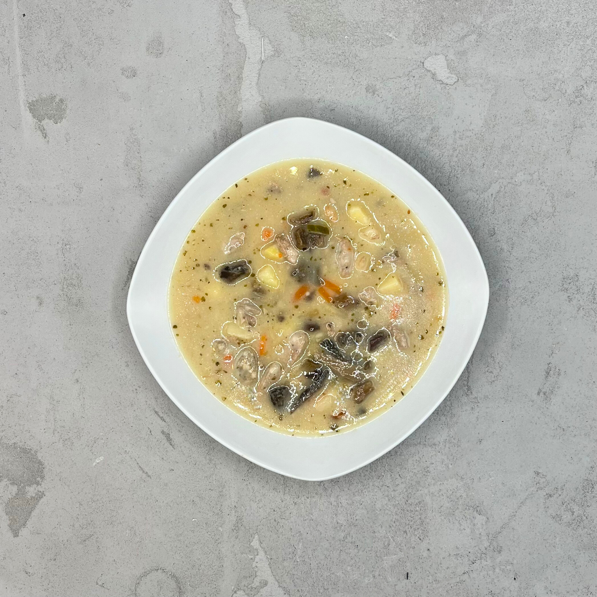 Skład- wywar na wędzonce, ziemniak, biała kiełbasa, maślanka, zakwas żytni, włoszczyzna, śmietanka, boczek, cebula, chrzan, sól, czosnek, cukier, suszone grzyby, majeranek, seler, gorczyca, mleko, gluten, jaja, soja.